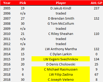 Holland’s Red Wings routinely reached over 100 points from 1999-2011. When you’re good for that long, you have good players and can afford to be patient with prospects.