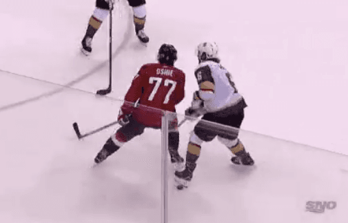 T.J. Oshie with the drop pass and reverse hit before Michal Kempny scores