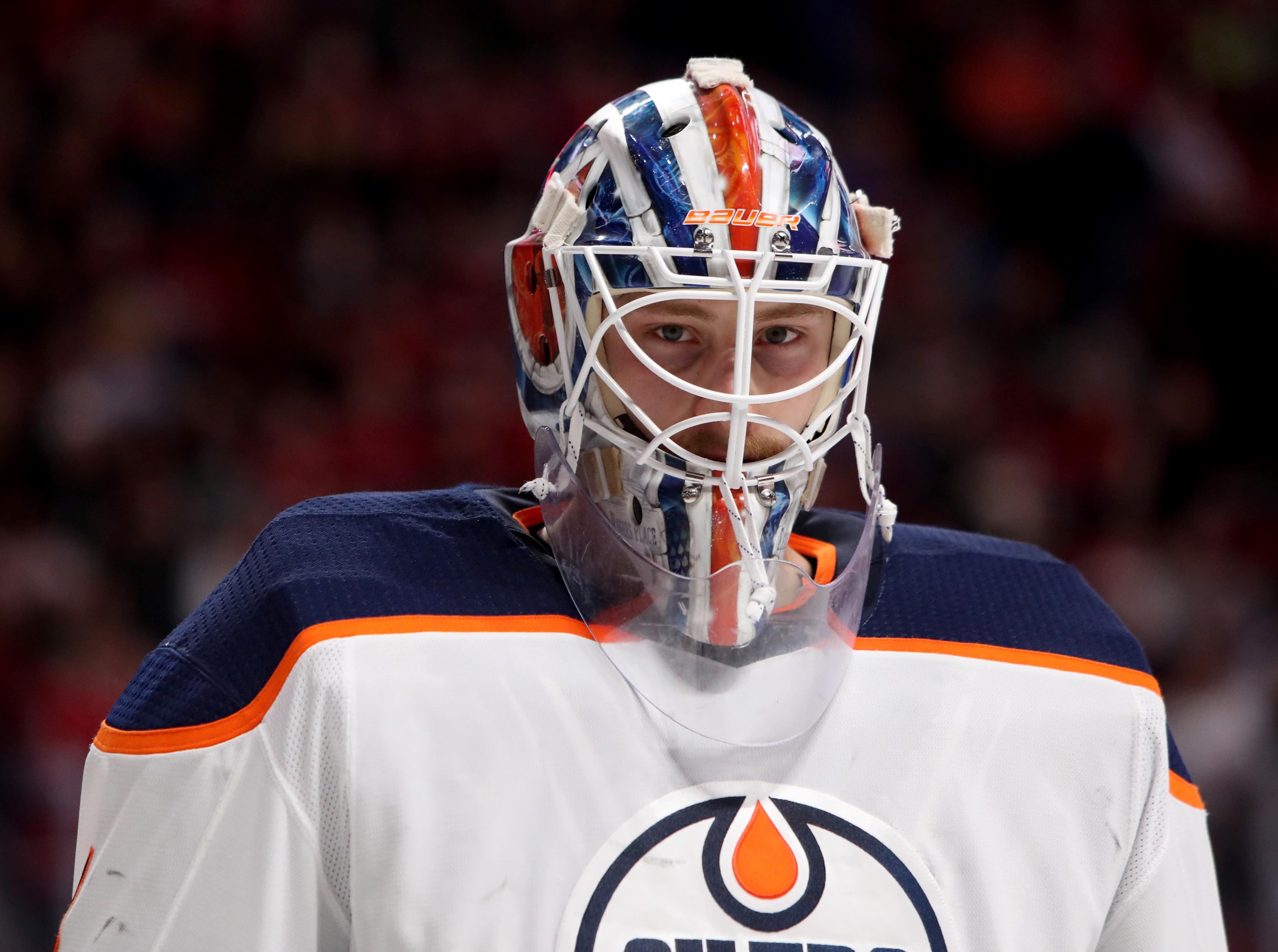 Dec 9, 2017; Montreal, Quebec, CAN; Edmonton Oilers goalie Laurent Brossoit (1) during the third period against Montreal Canadiens at Bell Centre. Mandatory Credit: Jean-Yves Ahern-USA TODAY Sports