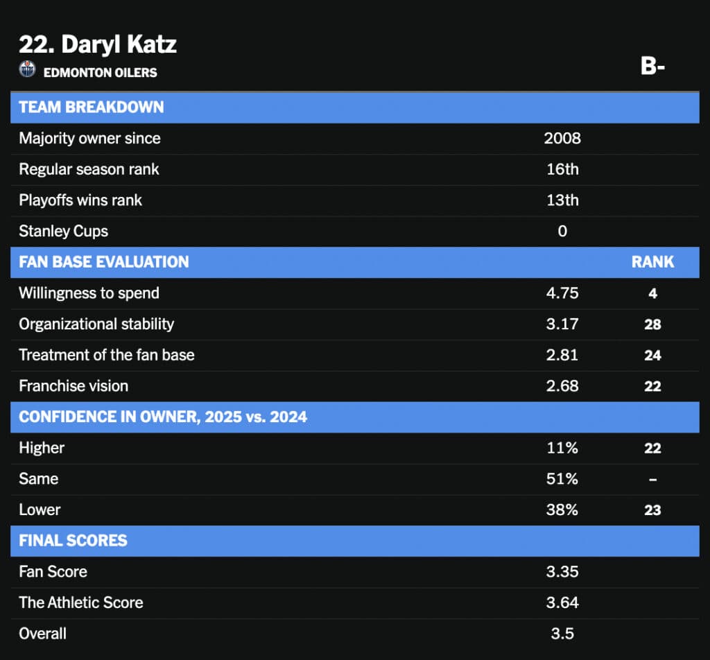 That’s the opinion of the fans of his team, who ripped into his ownership tenure in Edmonton in a fan poll conducted by The Athletic, where Katz ranked 22nd among the NHL’s 32 different owners.