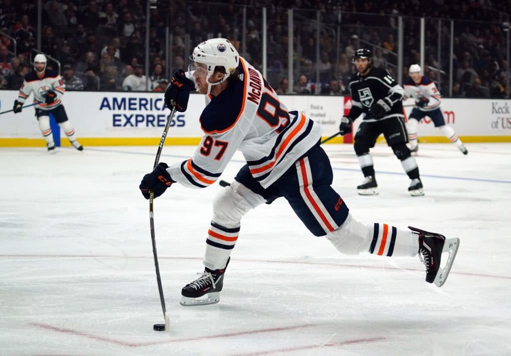 Feb 23, 2020; Los Angeles, California, USA; Edmonton Oilers center Connor McDavid (97) shoots the puck against the Los Angeles Kings in the third period at Staples Center. The Oiers defeated the Kings 4-2.