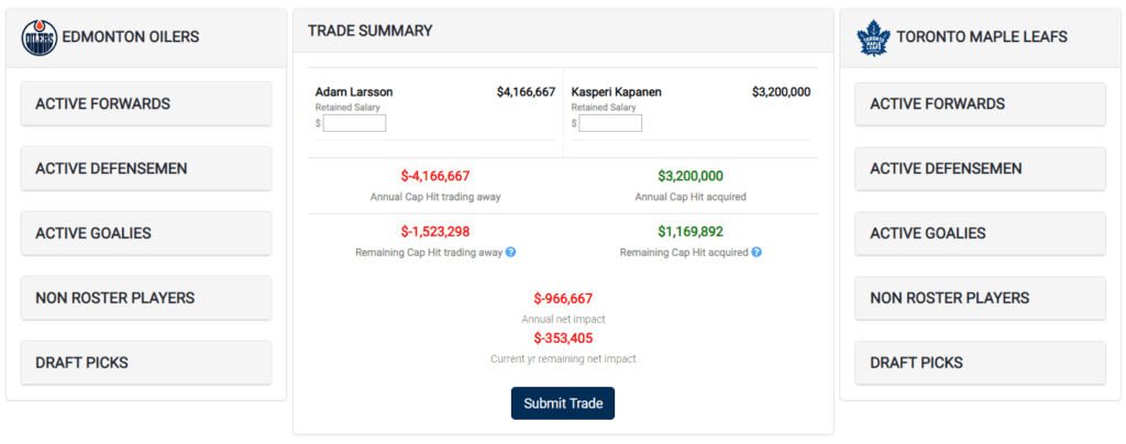Balancing out the salary numbers with the Edmonton Oilers eating $966,667 of Larsson salary for this year and next, and including a 2nd round draft pick might get the Leafs to bite.