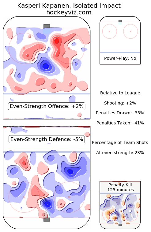 Kapanen has shown the ability to drive play at even-strength (52.51 CF%) while offering a good goal rate (52.53 GF%). He’s had limited time on Using hockeyviz.com’s Isolated Impact chart, you can see Kapanen provides above-average offence and defence.