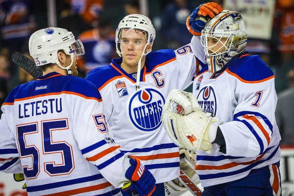 Jan 21, 2017; Calgary, Alberta, CAN; Edmonton Oilers goalie Laurent Brossoit (1) celebrate win with center Connor McDavid (97) and center Mark Letestu (55) after the game against the Calgary Flames at Scotiabank Saddledome. Edmonton Oilers won 7-3. Mandatory Credit: Sergei Belski-USA TODAY Sports