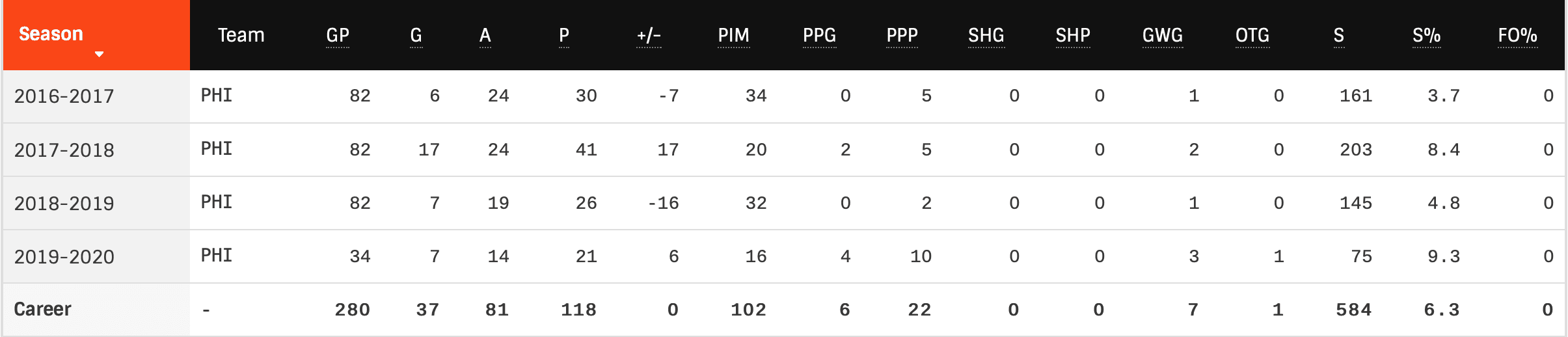 Season | GP | TOI | CF% | SCF% | GF% | xGF% | HDCF% | HDGF% |