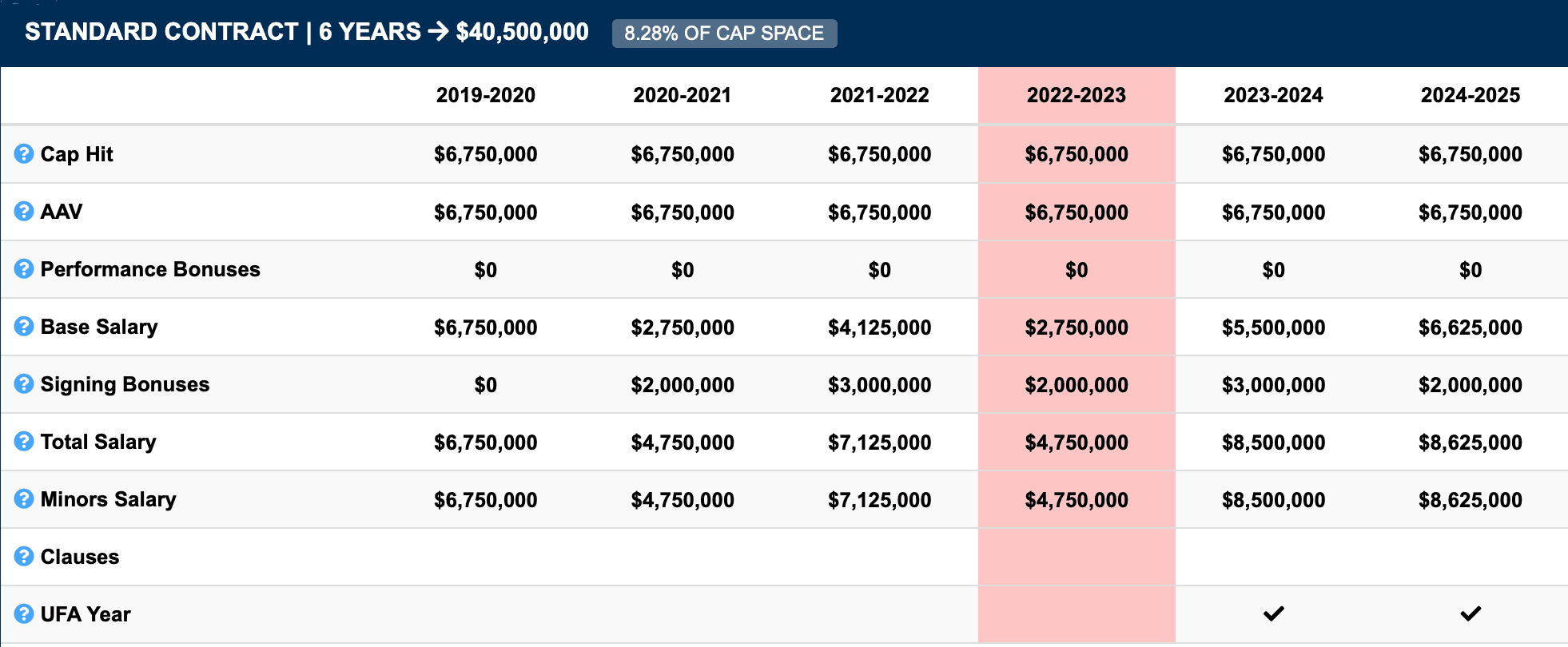 6 years, $6.75mil Cap Hit (Age: 22)