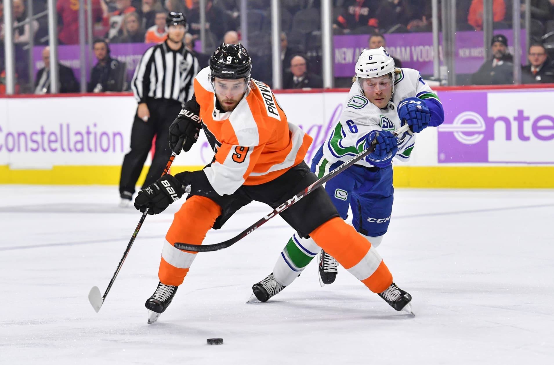 Nov 25, 2019; Philadelphia, PA, USA; Philadelphia Flyers defenseman Ivan Provorov (9) skates with the puck as Vancouver Canucks right wing Brock Boeser (6) defends during the first period at Wells Fargo Center.