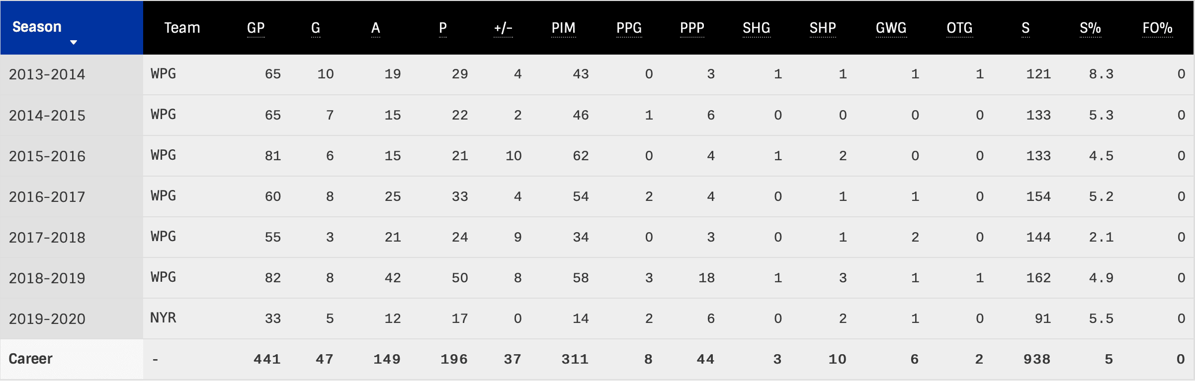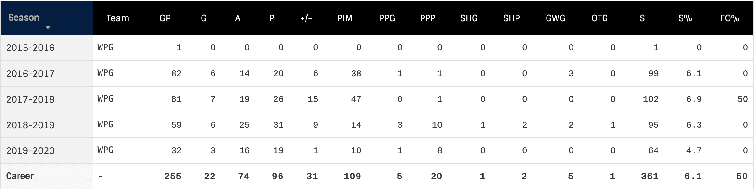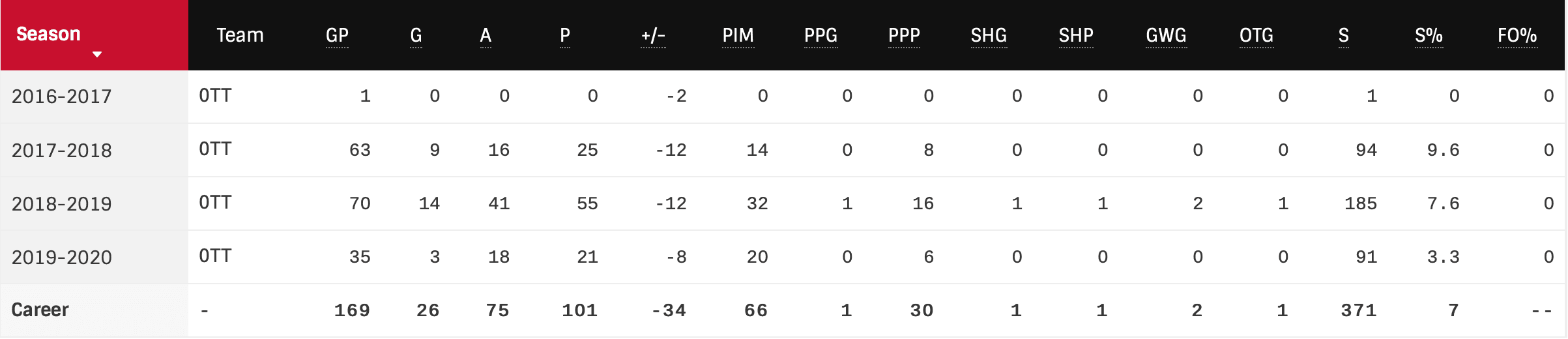 2016/17 | 1 | 7:09 | 45.00 | 22.22 | 0.00 | 42.58 | 50.00 | — |