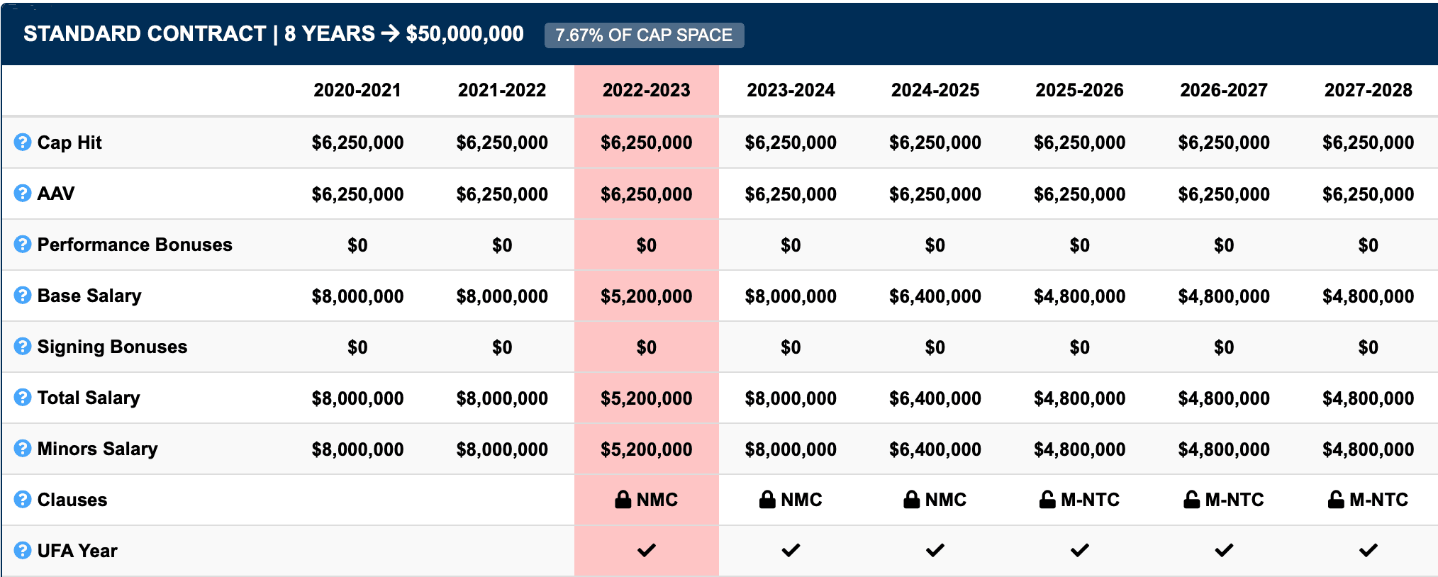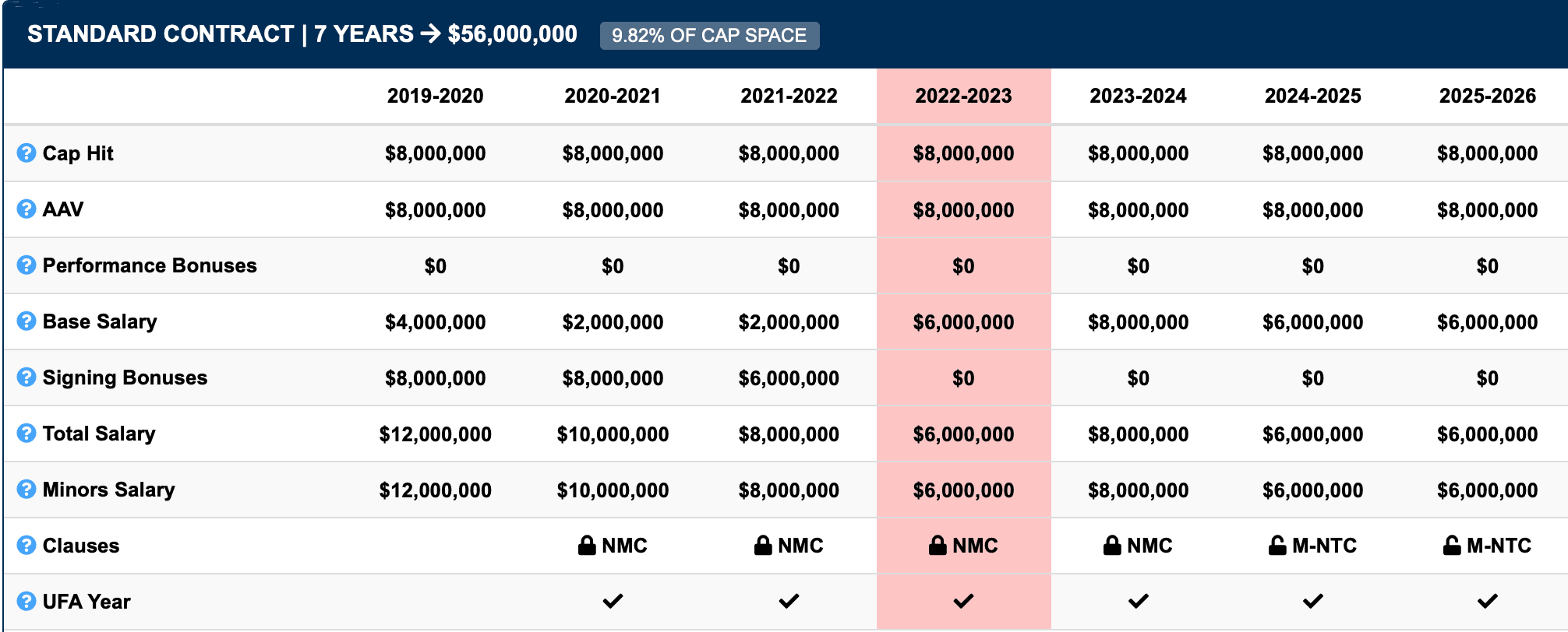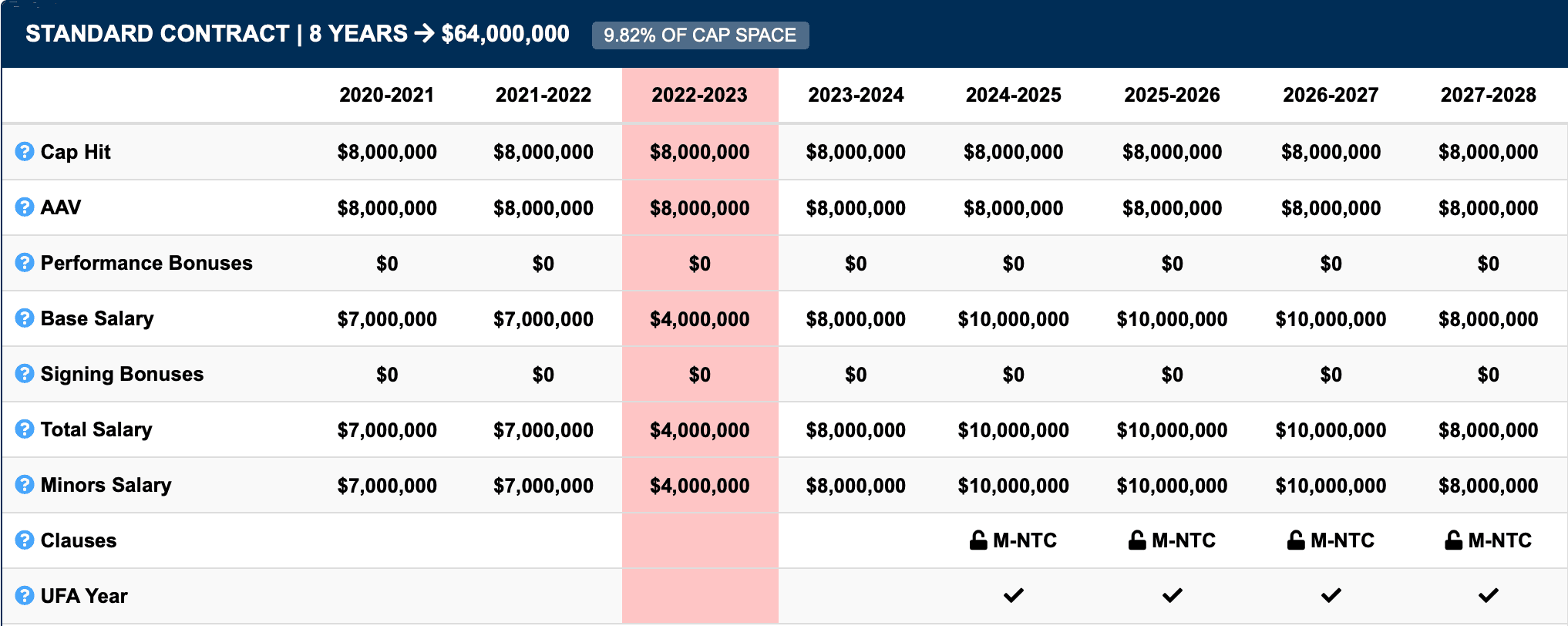 8 years, $8mil Cap Hit (Age: 22)