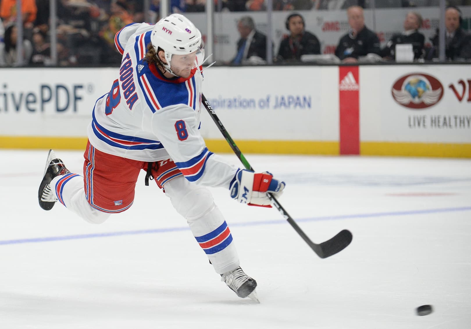December 14, 2019; Anaheim, CA, USA; New York Rangers defenseman Jacob Trouba (8) shoots on goal against the Anaheim Ducks during the first period at Honda Center.