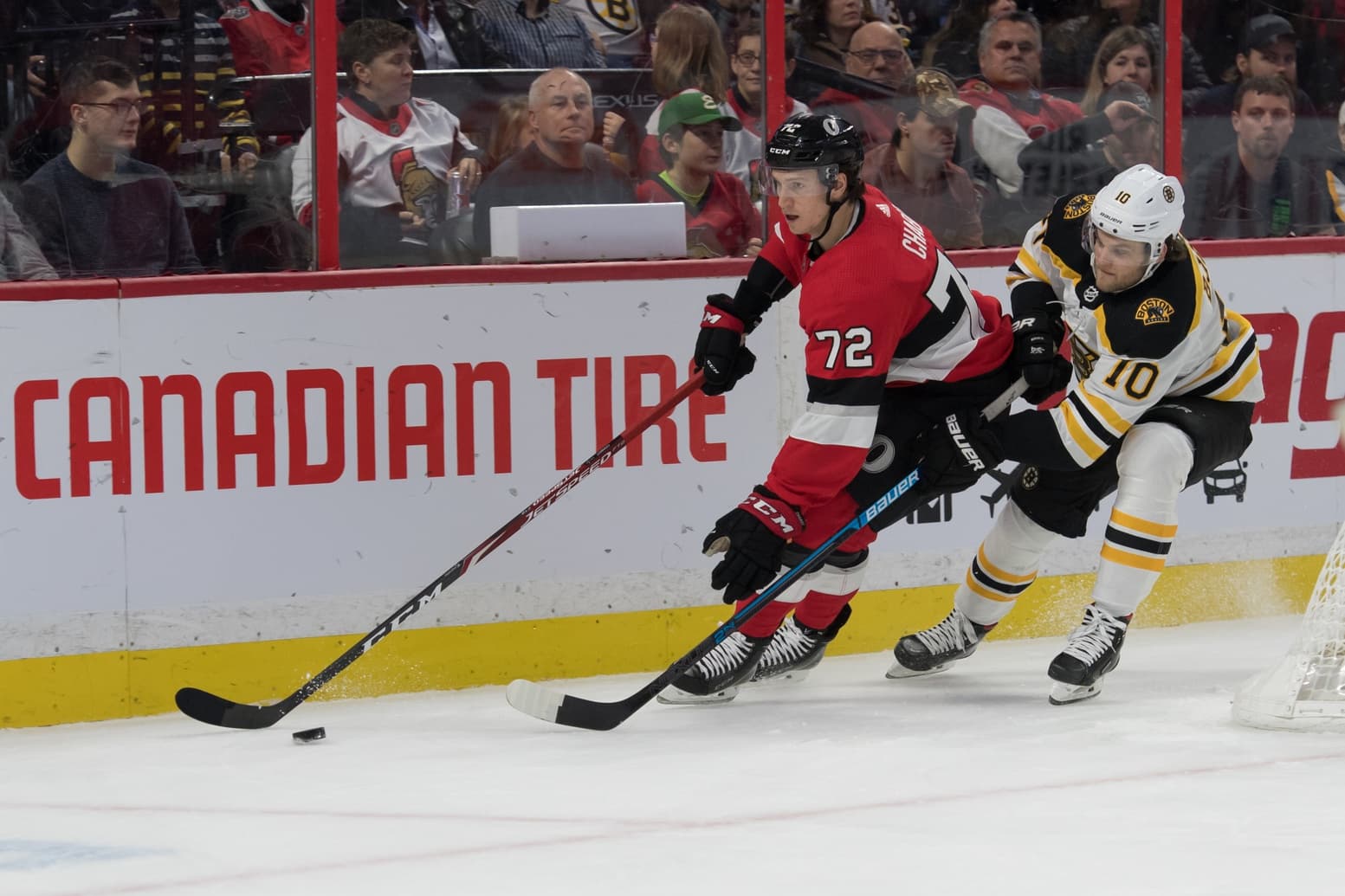 Dec 9, 2019; Ottawa, Ontario, CAN; Ottawa Senators defenseman Thomas Chabot (72) skates with the puck in front of Boston Bruins left wing Anders Bjork (10) in the first period at the Canadian Tire Centre.