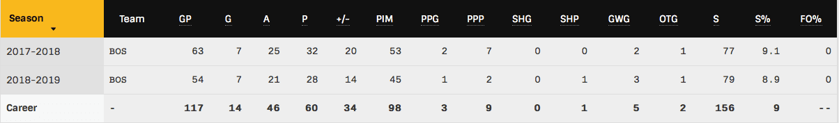 A very curious signing. McAvoy is the youngest of the bunch, being only a two year veteran, and has yet to stay particularly healthy so far. He hasn’t played any significant time on either special teams unit for the @Boston Bruins (1:18 PK TOI/GM, 13th on the team; 1:35 PP TOI/GM, 9th on the team). But, for three years at a relatively good cap hit for a player that is projected to play a huge role in the top four moving forward.