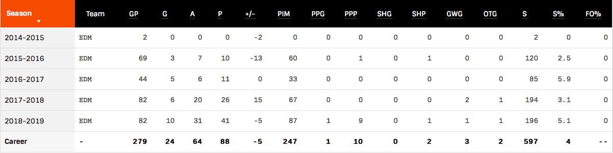 So the numbers look good; coming off a 41 point campaign, with a steady increase in points over four full seasons, is what you want to see in a top four defenceman. He also averaged 1:55 SH TOI/GM, which ranked third on the Oilers, and 1:51 PP TOI/GM, which was good for sixth.
