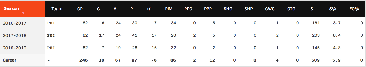 Like Morrissey, he led the @Philadelphia Flyers in PK TOI, averaging 2:54/GM, a team PK that finished 26th in the NHL last season at 78.5%, so not a great sign. He also averaged 1:33/GM in PP TOI, which ranked ninth on the team, so that might have been a contributing factor to his lower point total.