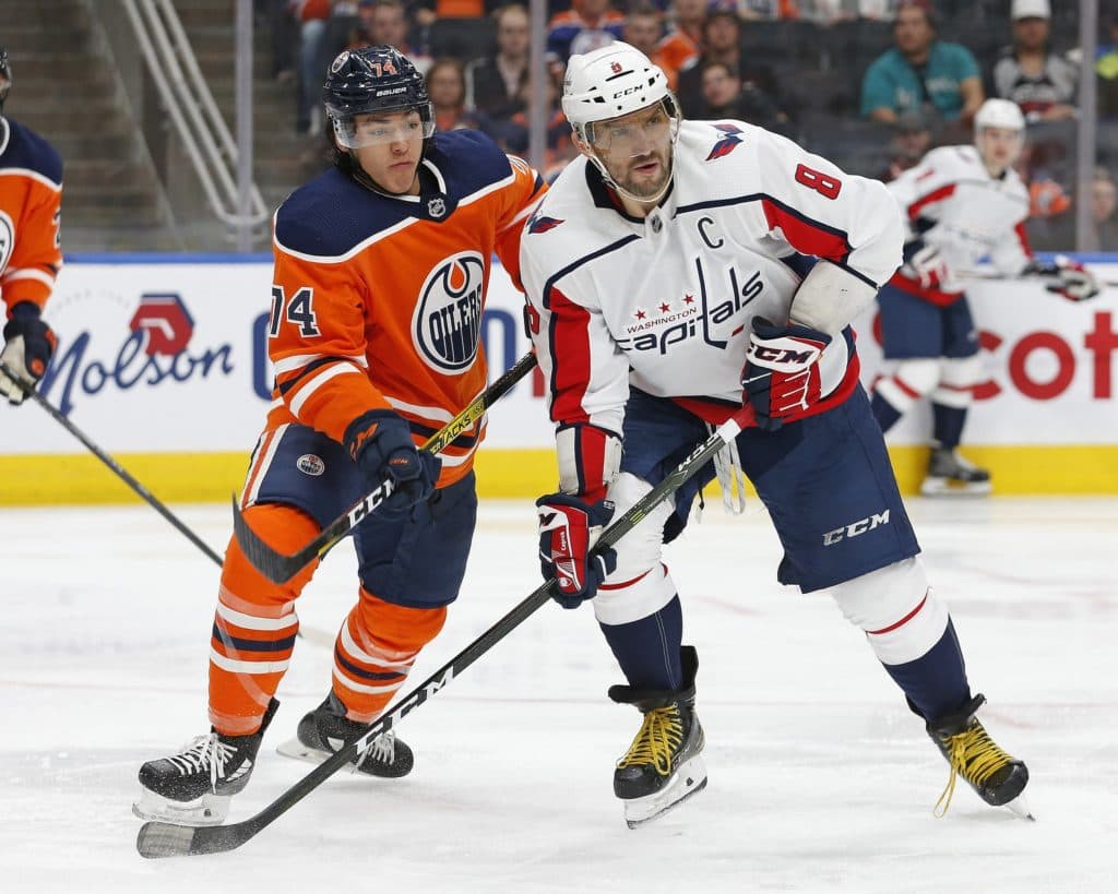 Oct 24, 2019; Edmonton, Alberta, CAN; Edmonton Oilers defensemen Ethan Bear (74) and Washington Capitals forward Alex Ovechkin (8) battle for position during the second period at Rogers Place. Mandatory Credit: Perry Nelson-USA TODAY Sports