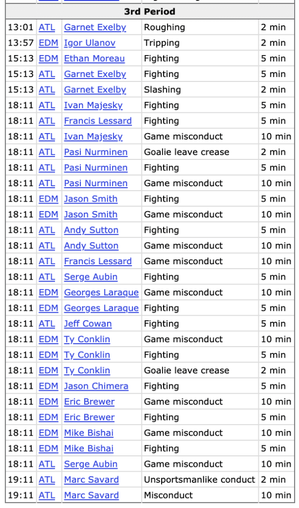 Shawn Horcoff and Jarret Stoll scored to give the Oilers a comfortable 4-1 lead. After the fourth goal, Thrashers defenceman Garnet Exelby speared Ethan Moreau, and the pair dropped the gloves. Play resumed as normal for a few minutes before Atlanta put all of their goons on the ice at once and things really started to get wild.