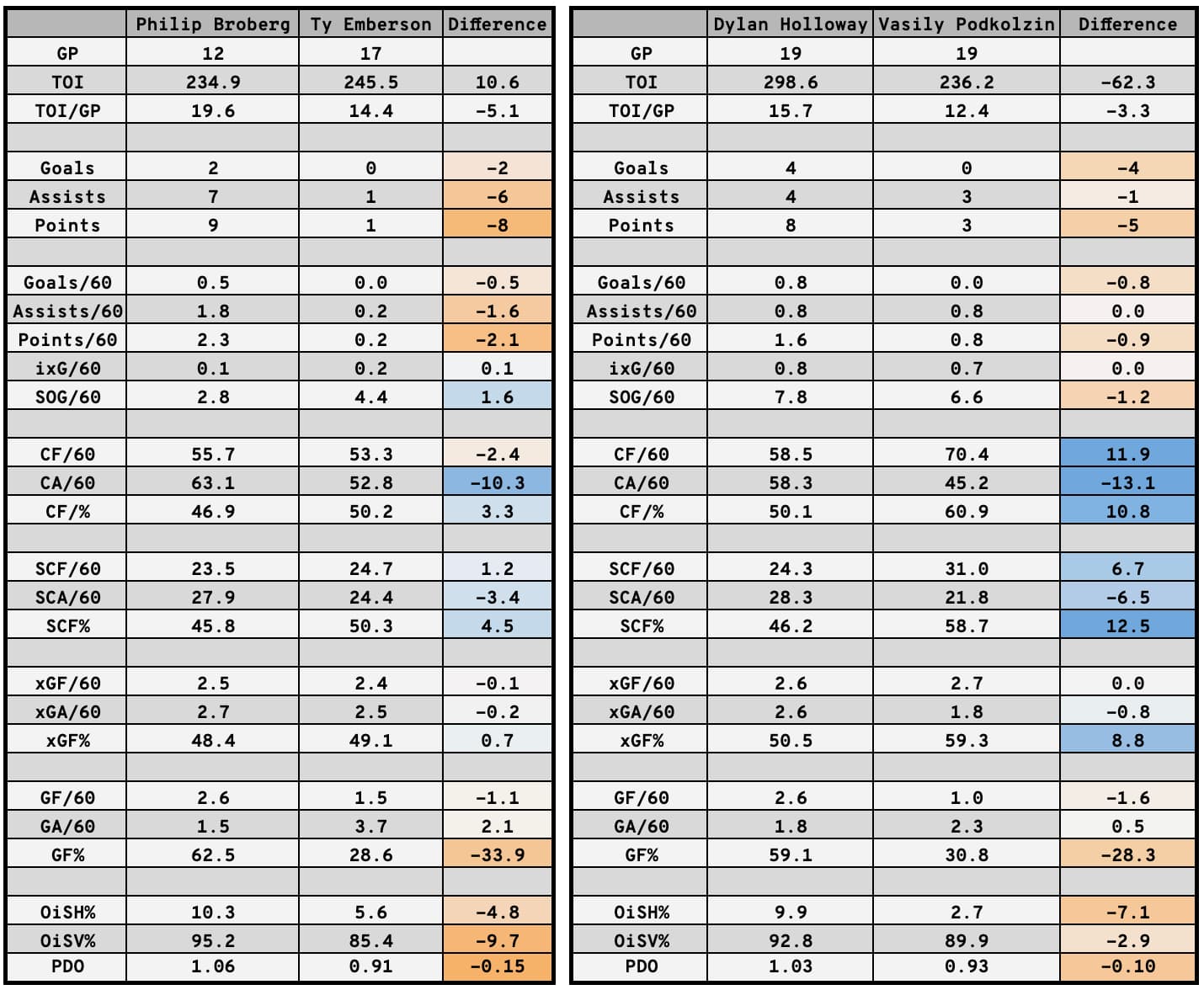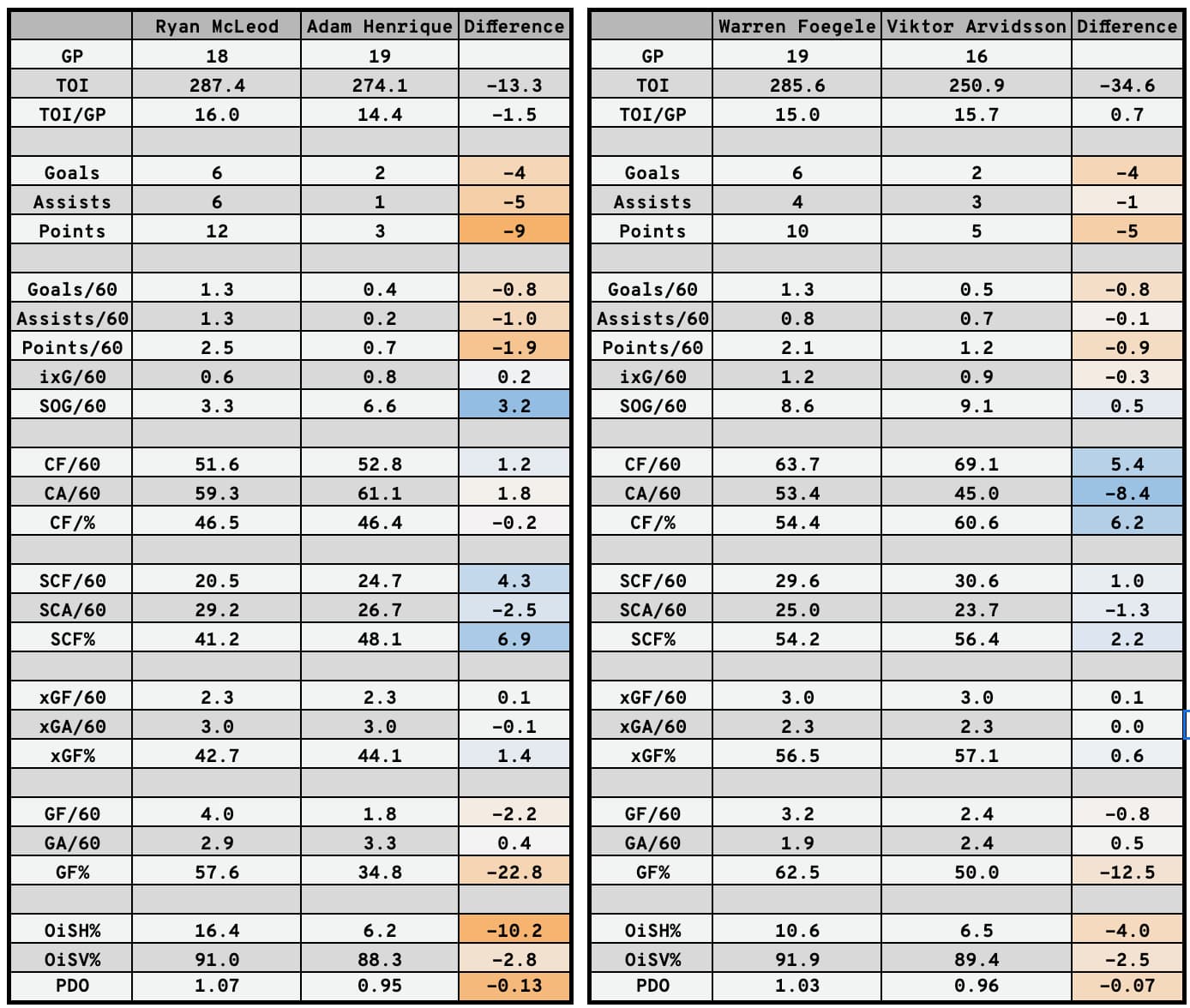 Here, for example, is a look at how Ryan McLeod and Warren Foegele’s seasons have gone compared to Henrique and Arvidsson’s: