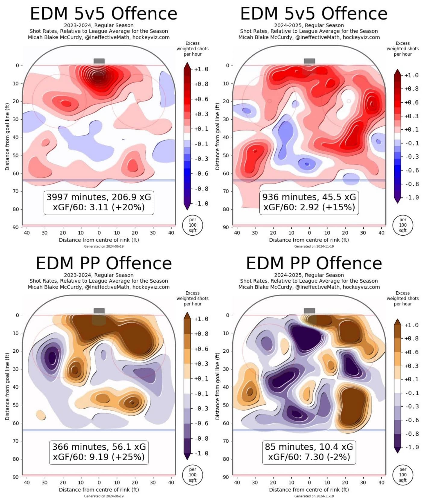 Other offensive concerns are present, too. For some reason, the Oilers have gone from being a team driving hard to the blue paint to generate shots, scoring chances and goals, they’ve instead opted to start firing the puck from many areas that create much less offence.