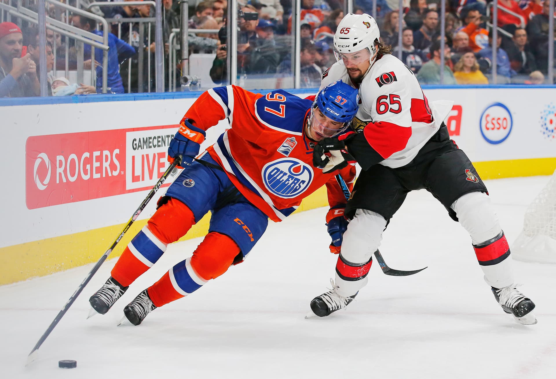 Oct 30, 2016; Edmonton, Alberta, CAN; Ottawa Senators defensemen Erik Karlsson (65) tries to check Edmonton Oilers forward Connor McDavid (97) during the second period at Rogers Place. Mandatory Credit: Perry Nelson-USA TODAY Sports