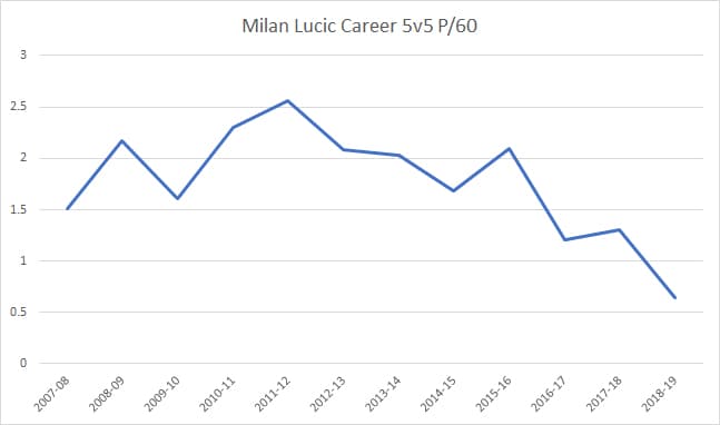 Points per 60 measures a player’s production over their ice time and multiplied to 60 minutes. Top-line talent generally score around 2 points per 60, where Lucic hovered for most of his time with Boston and Los Angeles. In Edmonton, he’s scored like a third or fourth-line player 5-on-5.