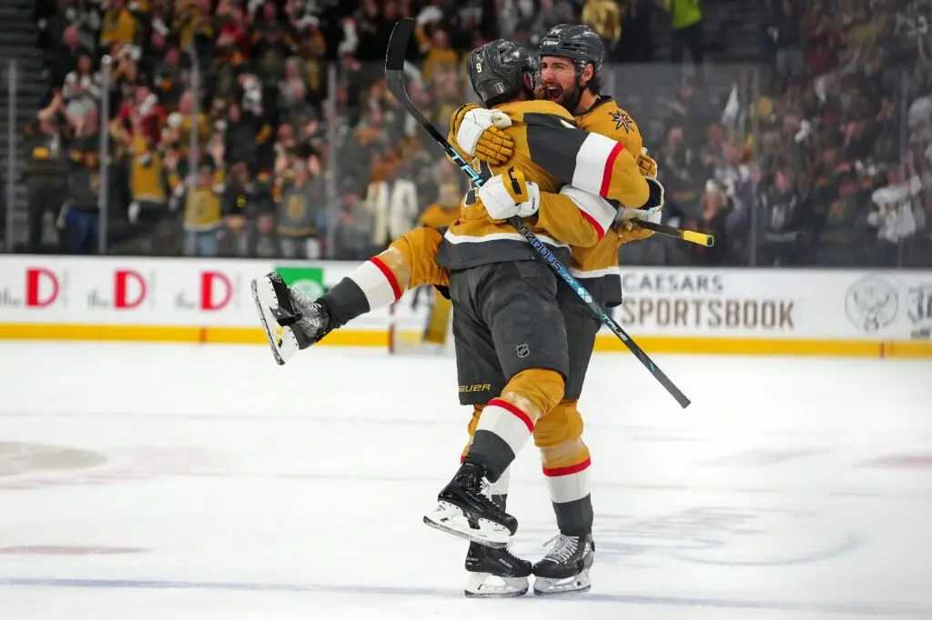May 12, 2023; Las Vegas, Nevada, USA; Vegas Golden Knights defenseman Nicolas Hague (14) celebrates with Vegas Golden Knights center Jack Eichel (9) after scoring a goal against the Edmonton Oilers during the second period of game five of the second round of the 2023 Stanley Cup Playoffs at T-Mobile Arena. Mandatory Credit: Stephen R. Sylvanie-USA TODAY Sports