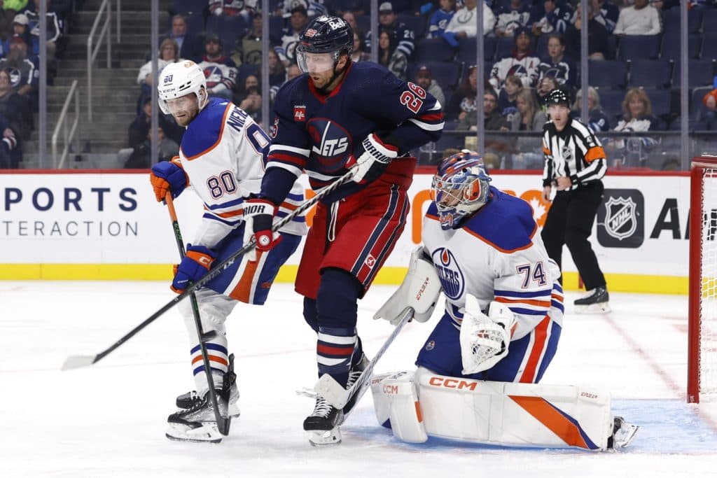 Oct 1, 2022; Winnipeg, Manitoba, CAN; Edmonton Oilers defenseman Markus Niemelainen (80) and goaltender Stuart Skinner (74) and Winnipeg Jets left wing Pierre-Luc Dubois (80) watch the puck in the second period at Canada Life Centre. Mandatory Credit: James Carey Lauder-USA TODAY Sports