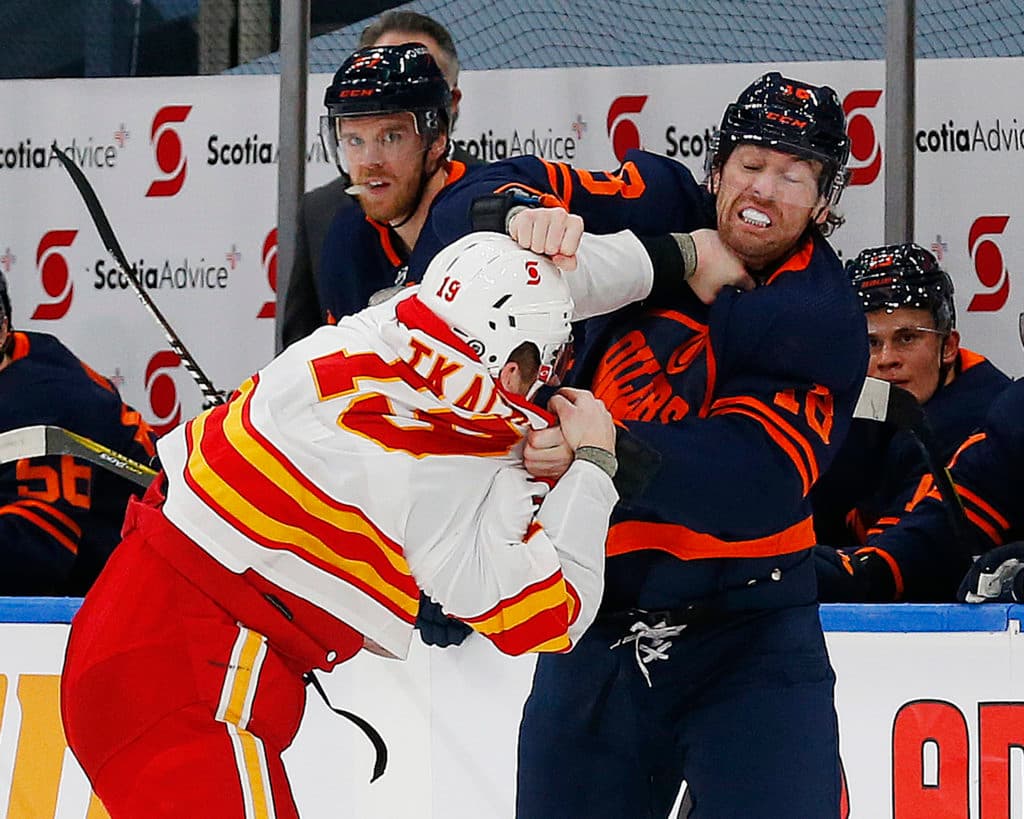Mar 6, 2021; Edmonton, Alberta, CAN; Calgary Flames forward Matt Tkachuk (19) and Edmonton Oilers forward James Neal (18) fight during the first period at Rogers Place.