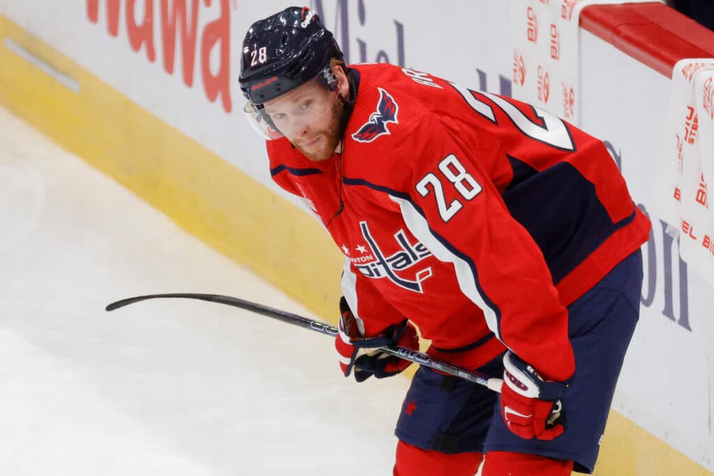 Oct 5, 2022; Washington, District of Columbia, USA; Washington Capitals right wing Connor Brown (28) on ice prior to the Capitals’ game against the Detroit Red Wings at Capital One Arena. Mandatory Credit: Geoff Burke-USA TODAY Sports