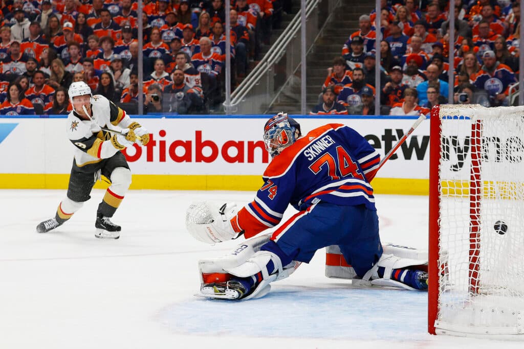May 8, 2023; Edmonton, Alberta, CAN; Vegas Golden Knights forward Jack Eichel (9) scores a goal during the second period against Edmonton Oilers goaltender Stuart Skinner (74) in game three of the second round of the 2023 Stanley Cup Playoffs at Rogers Place. Mandatory Credit: Perry Nelson-USA TODAY Sports