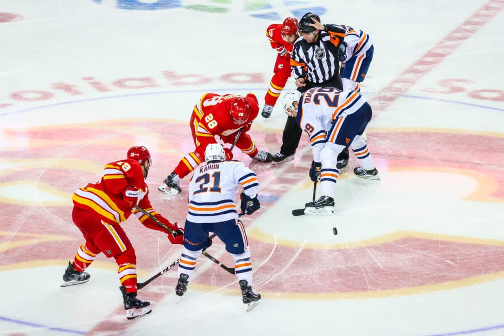 Apr 10, 2021; Calgary, Alberta, CAN; Calgary Flames center Elias Lindholm (28) and Edmonton Oilers center Leon Draisaitl (29) faces off for the puck during the second period at Scotiabank Saddledome.