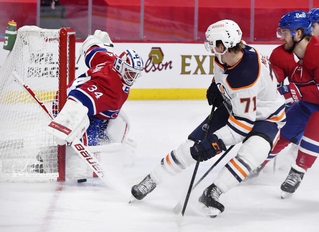 May 10, 2021; Montreal, Quebec, CAN; Montreal Canadiens goalie Jake Allen (34) makes a save in front of Edmonton Oilers forward Ryan McLeod (71) during the third period at the Bell Centre. Mandatory Credit: Eric Bolte-USA TODAY Sports