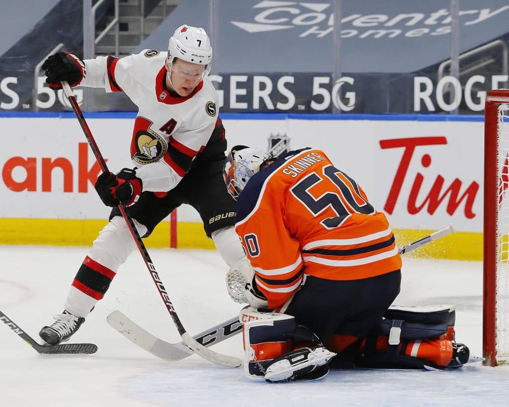 Jan 31, 2021; Edmonton, Alberta, CAN; Edmonton Oilers goaltender Stuart Skinner (50) makes a save against Ottawa Senators forward Brady Tkachuk (7) during the second period at Rogers Place. Mandatory Credit: Perry Nelson-USA TODAY Sports