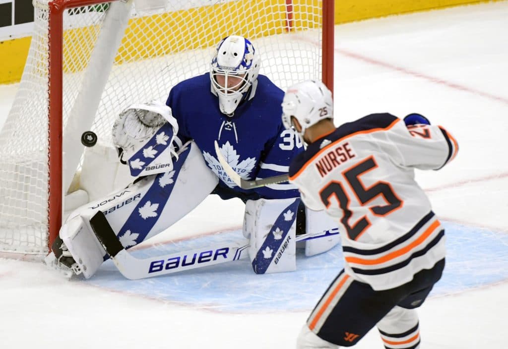 Mar 29, 2021; Toronto, Ontario, CAN; Edmonton Oilers defenseman Darnell Nurse (25) scores the game winning goal past Toronto Maple Leafs goalie Michael Hutchinson (30) in overtime at Scotiabank Arena. Mandatory Credit: Dan Hamilton-USA TODAY Sports