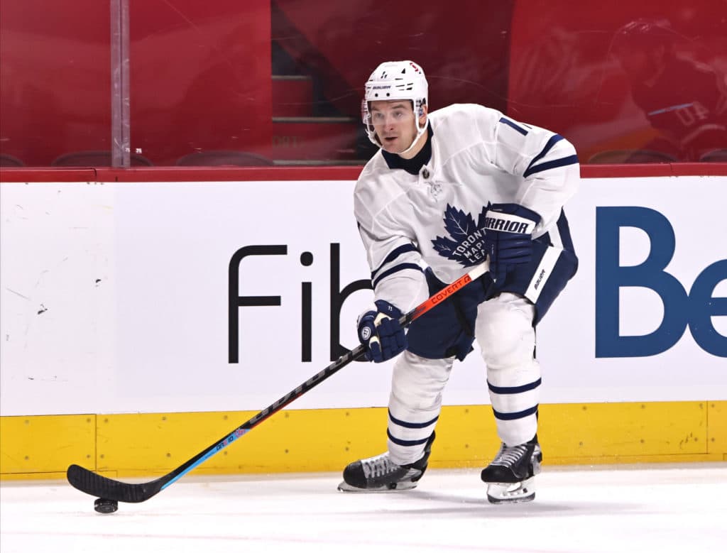 Feb 20, 2021; Montreal, Quebec, CAN; Toronto Maple Leafs left wing Zach Hyman (11) plays the puck against Montreal Canadiens at Bell Centre. Mandatory Credit: Jean-Yves Ahern-USA TODAY Sports