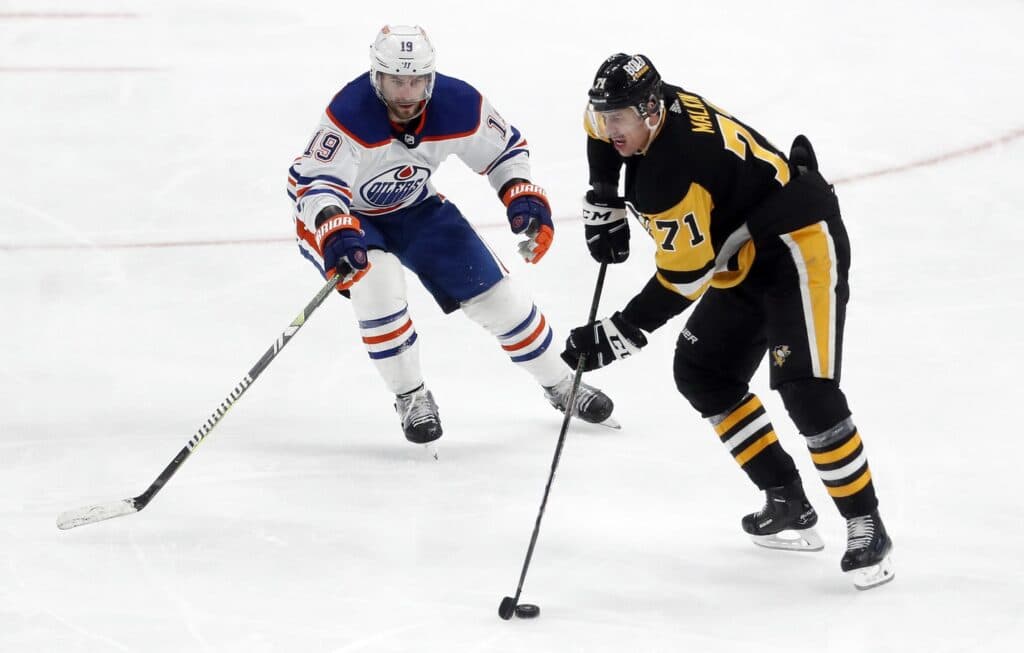Mar 10, 2024; Pittsburgh, Pennsylvania, USA; Pittsburgh Penguins center Evgeni Malkin (71) moves the puck against Edmonton Oilers center Adam Henrique (19) during the third period at PPG Paints Arena. The Oilers won 4-0. Mandatory Credit: Charles LeClaire-USA TODAY Sports