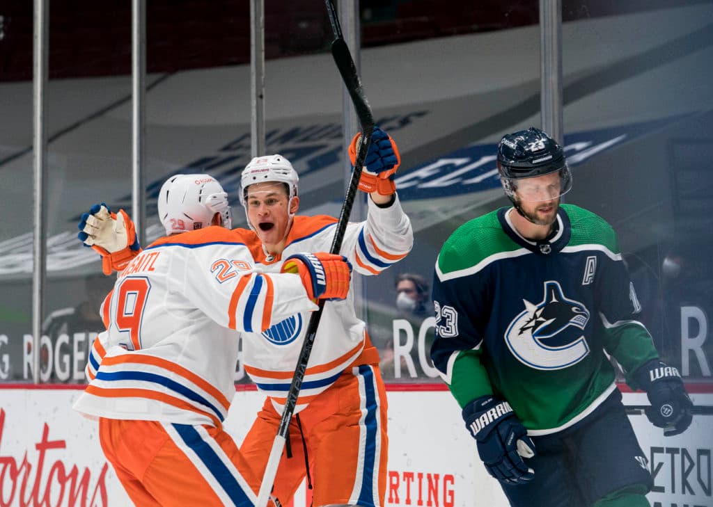 Feb 25, 2021; Vancouver, British Columbia, CAN; Edmonton Oilers forward Jesse Puljujarvi (13) celebrates with forward Leon Draisaitl (29) after scoring agoal as Vancouver Canucks defenseman Alexander Edler (23) skates away in the third period at Rogers Arena. Edmonton won 3-0.