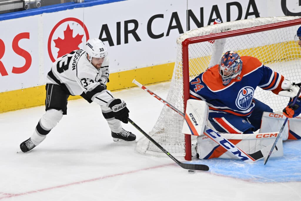Apr 17, 2023; Edmonton, Alberta, CAN; Los Angeles Kings right wing Viktor Arvidsson (33) takes a shot on Edmonton Oilers goalie Stuart Skinner (74) during the first period in game one of the first round of the 2023 Stanley Cup Playoffs at Rogers Place. Mandatory Credit: Walter Tychnowicz-USA TODAY Sports