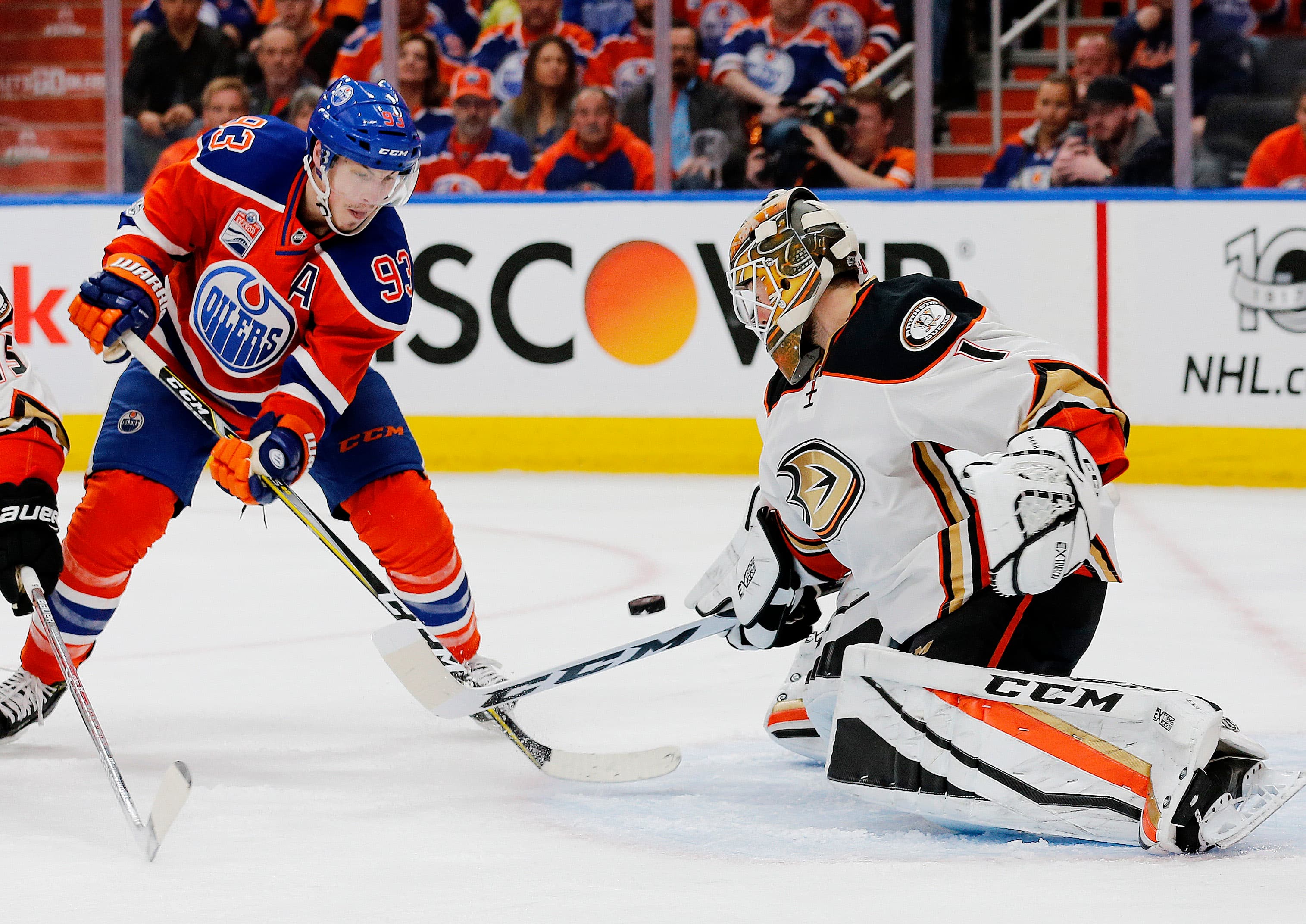 May 7, 2017; Edmonton, Alberta, CAN; Edmonton Oilers forward Ryan Nugent-Hopkins (93) is stopped by Anaheim Ducks goaltender Jonathan Bernier (1) during the third period in game six of the second round of the 2017 Stanley Cup Playoffs at Rogers Place. Mandatory Credit: Perry Nelson-USA TODAY Sports