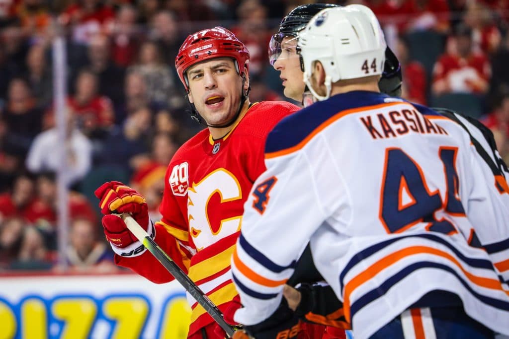 Jan 11, 2020; Calgary, Alberta, CAN; Calgary Flames left wing Milan Lucic (17) and Edmonton Oilers right wing Zack Kassian (44) exchanges words during the third period at Scotiabank Saddledome. Calgary Flames won 4-3. Mandatory Credit: Sergei Belski-USA TODAY Sports