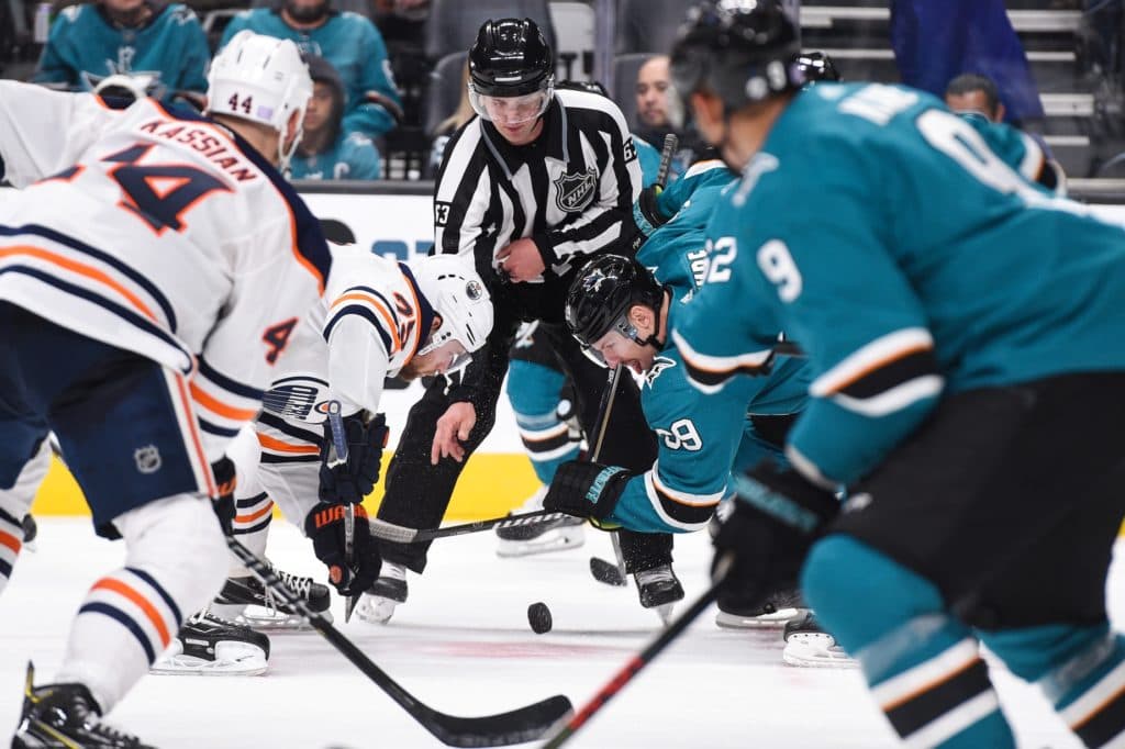 Nov 19, 2019; San Jose, CA, USA; San Jose Sharks center Logan Couture (39) breaks his stick during a face-off against Edmonton Oilers defenseman Darnell Nurse (25) during the third period at SAP Center in San Jose. Mandatory Credit: Cody Glenn-USA TODAY Sports
