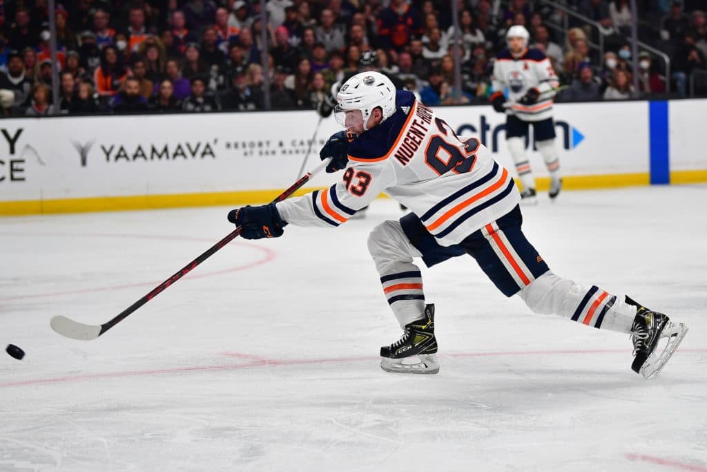 May 8, 2022; Los Angeles, California, USA; Edmonton Oilers center Ryan Nugent-Hopkins (93) shoots on goal against the Los Angeles Kings during the third period in game four of the first round of the 2022 Stanley Cup Playoffs at Crypto.com Arena. Mandatory Credit: Gary A. Vasquez-USA TODAY Sports
