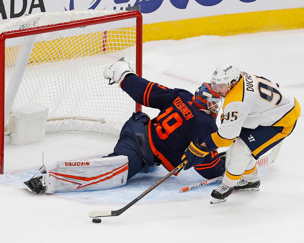 Jan 27, 2022; Edmonton, Alberta, CAN; Edmonton Oilers goaltender Mikko Koskinen (19) makes a save on Nashville Predators forward Matt Duchene (95) during the shoot-out at Rogers Place. Mandatory Credit: Perry Nelson-USA TODAY Sports