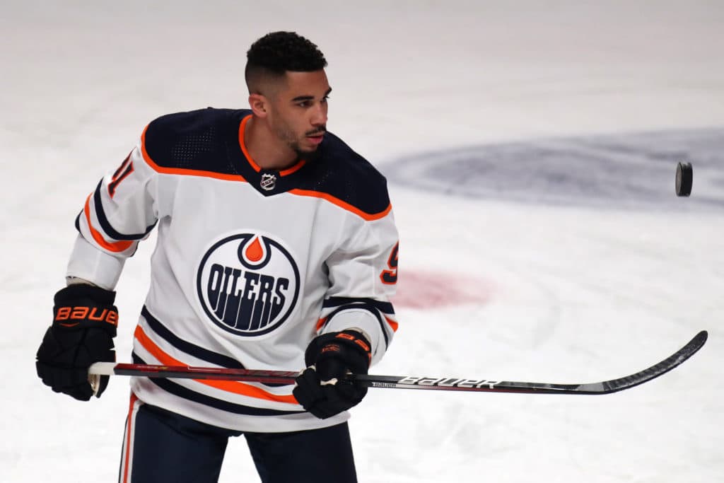 Jan 29, 2022; Montreal, Quebec, CAN; Edmonton Oilers left wing Evander Kane (91) during the warm-up session before the game against Montreal Canadiens at Bell Centre. Mandatory Credit: Jean-Yves Ahern-USA TODAY Sports