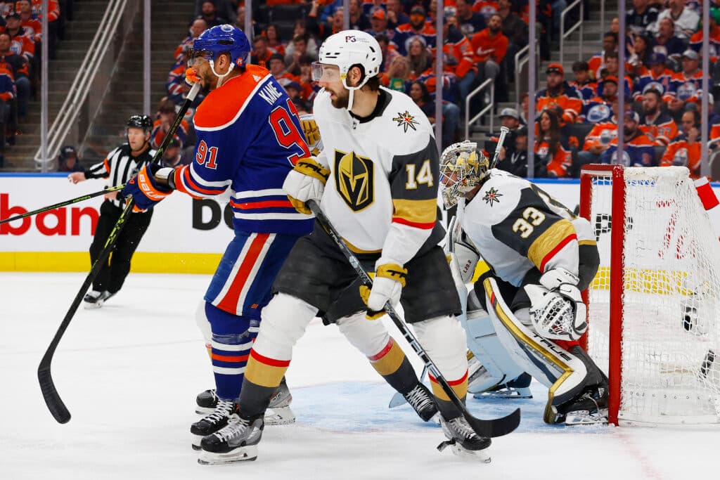 May 8, 2023; Edmonton, Alberta, CAN; Edmonton Oilers forward Evander Kane (91) battles with Vegas Golden Knights defensemen Nicolas Hague (14) in front of Vegas Golden Knights goaltender Adin Hill (33) during the third period in game three of the second round of the 2023 Stanley Cup Playoffs at Rogers Place. Mandatory Credit: Perry Nelson-USA TODAY Sports