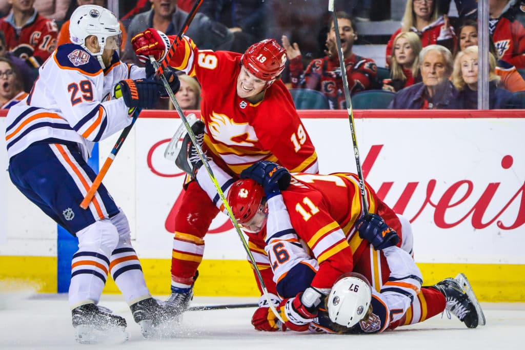 Nov 17, 2018; Calgary, Alberta, CAN; Calgary Flames center Mikael Backlund (11) and left wing Matthew Tkachuk (19) fight with Edmonton Oilers center Connor McDavid (97) and center Leon Draisaitl (29) during the first period at Scotiabank Saddledome.