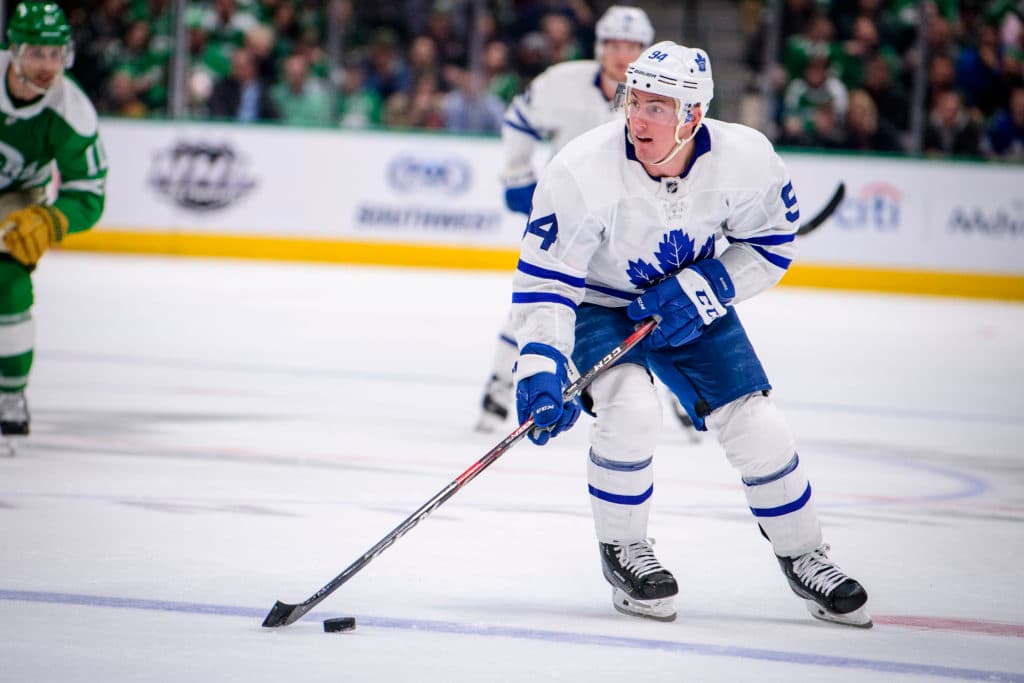 Jan 29, 2020; Dallas, Texas, USA; Toronto Maple Leafs defenseman Tyson Barrie (94) skates against the Dallas Stars during the third period at the American Airlines Center.