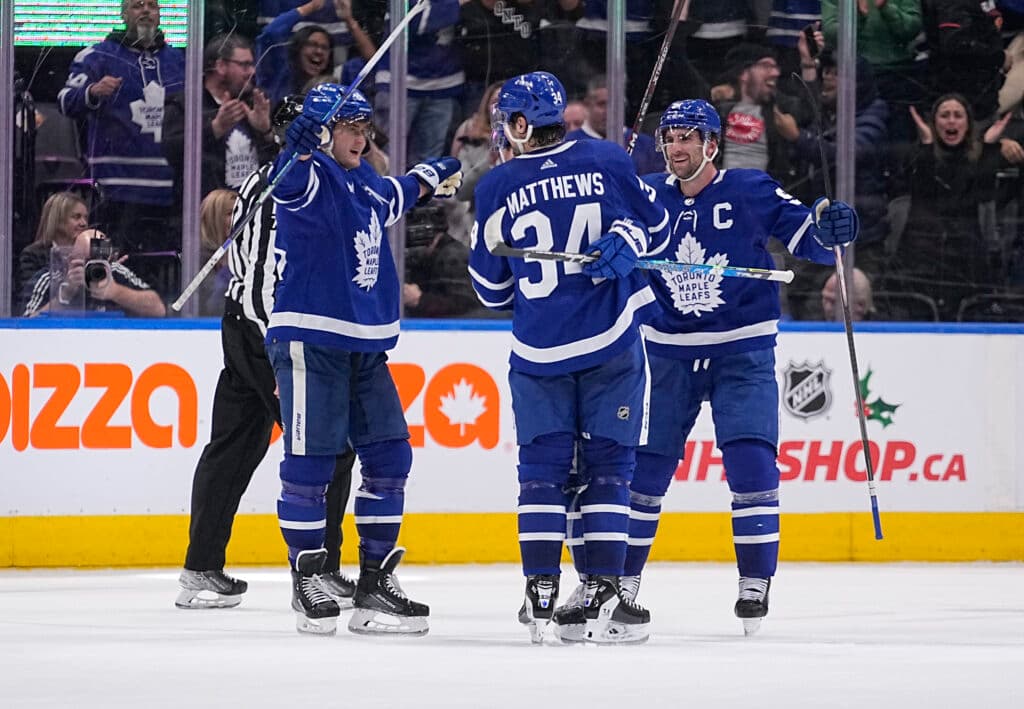Dec 10, 2022; Toronto, Ontario, CAN; Toronto Maple Leafs forward William Nylander (88) and forward Auston Matthews (34) and forward John Tavares (91) celebrate after a goal by forward Mitchell Marner (not pictured) to defeat the Calgary Flames in overtime at Scotiabank Arena. Mandatory Credit: John E. Sokolowski-USA TODAY Sports