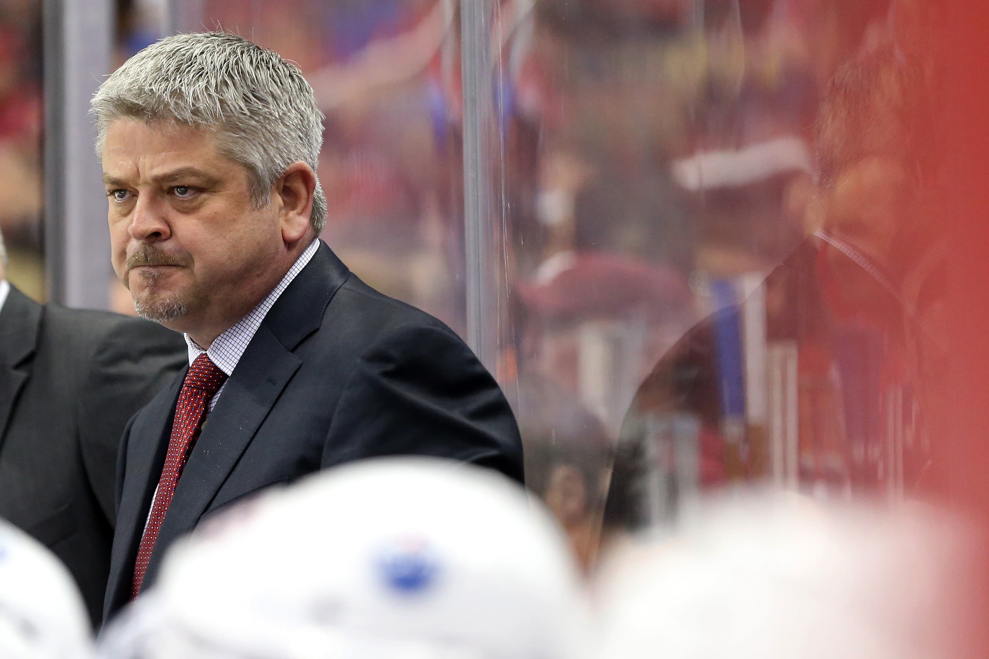 Feb 24, 2017; Washington, DC, USA; Edmonton Oilers head coach Todd McLellan looks on from behind the bench against the Washington Capitals in the first period at Verizon Center. The Capitals won 2-1. Mandatory Credit: Geoff Burke-USA TODAY Sports