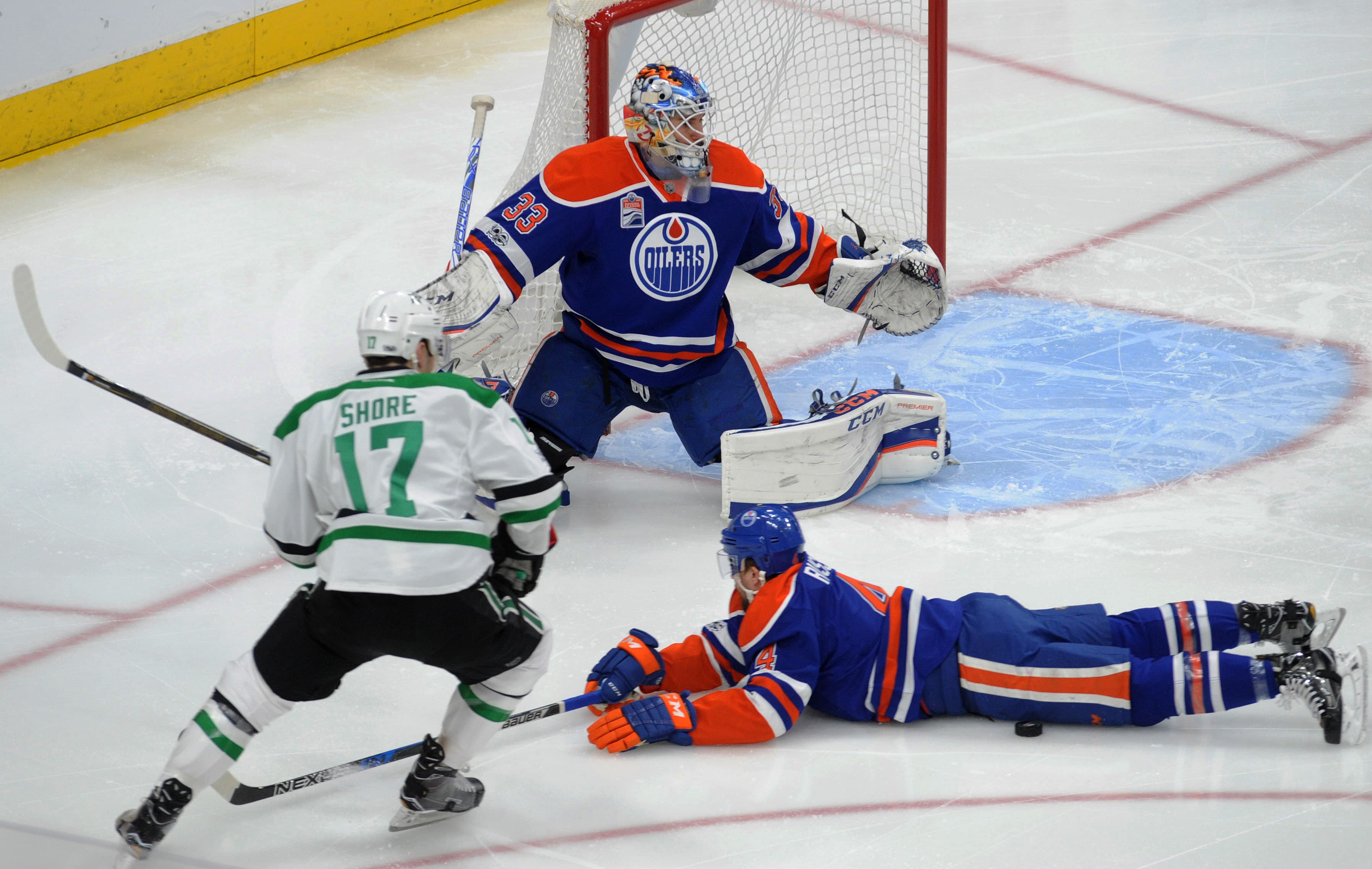 Mar 14, 2017; Edmonton, Alberta, CAN; Edmonton Oilers defenseman Kris Russell (4) makes a body save as Oilers goalie Cam Talbot (33) looks for the puck against Dallas Stars center Devin Shore (17) during the first period at Rogers Place. The Oilers won the game 7-1. Mandatory Credit: Walter Tychnowicz-USA TODAY Sports