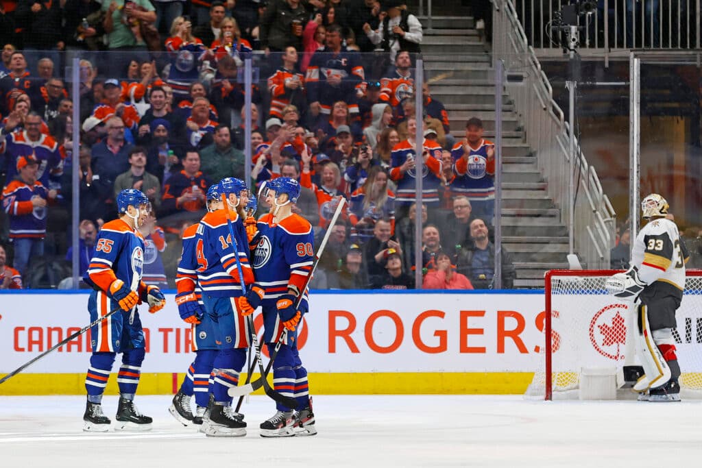Apr 10, 2024; Edmonton, Alberta, CAN; The Edmonton Oilers celebrate a goal scored by defensemen Mattias Ekholm (14) during the second period against the Vegas Golden Knights at Rogers Place. Mandatory Credit: Perry Nelson-USA TODAY Sports